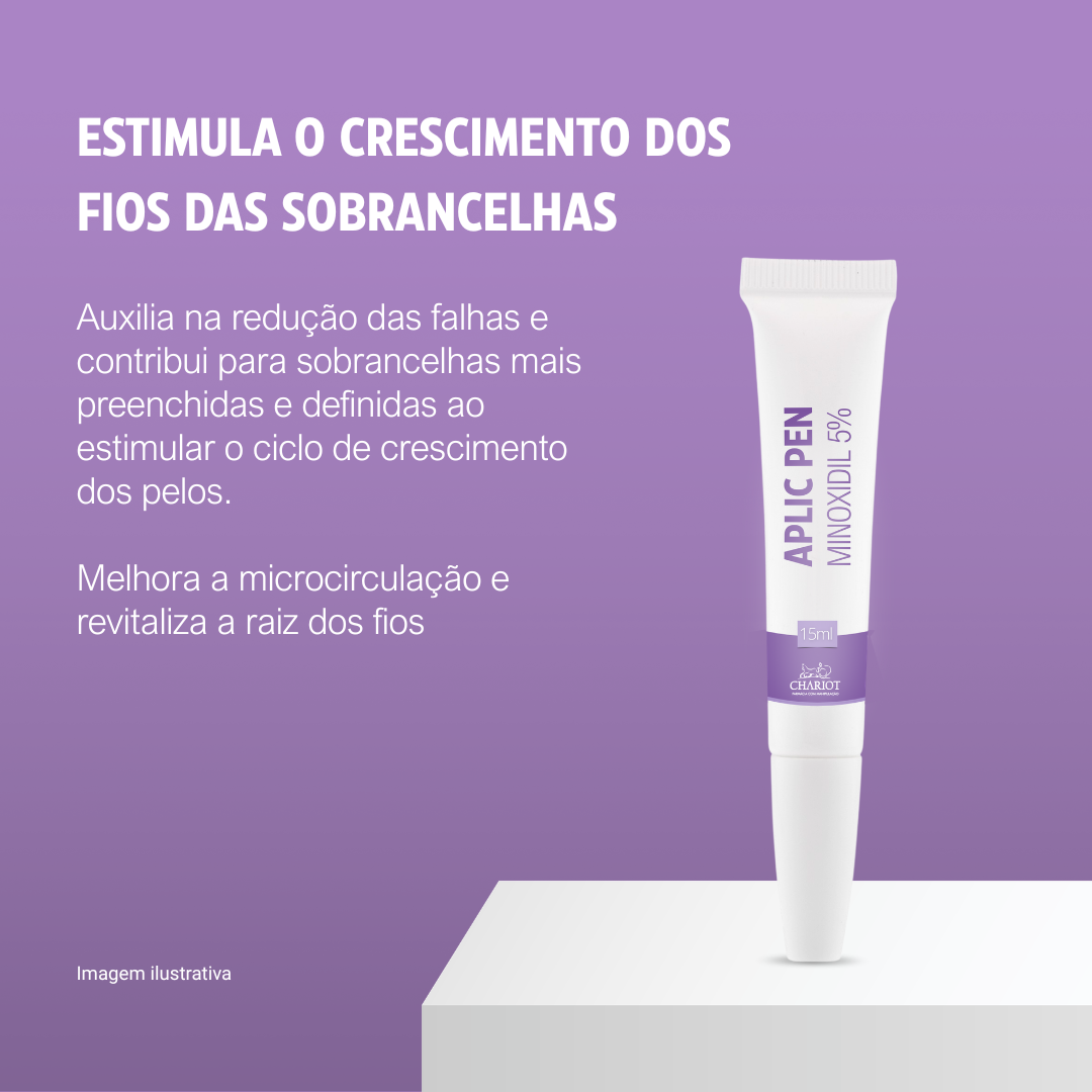 Aplic Pen Minoxidil é uma fórmula tópica indicada para estimular o crescimento dos fios das sobrancelhas, reduzindo áreas com falhas. O minoxidil é um ativo vasodilatador que melhora a microcirculação ao redor do folículo piloso, favorecendo a revitalização de regiões onde os fios não cresciam mais. Embalagem em formato de caneta, para aplicação prática e precisa.